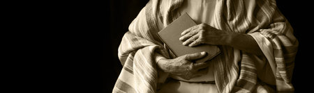 Closeup senior elder cathol church school new paper page israel law concept. Devot age jew guy pastor take word trust love hope jewish femal girl speak sacred saint biblic preach dark black text space