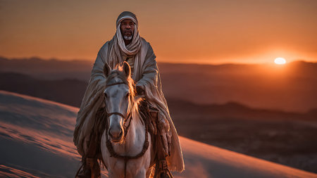 Desert father monk walking barefoot through the dunes at sunset, symbol of early Christian ascetic life, solitude, prayer and faith.