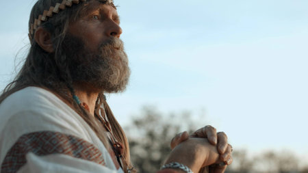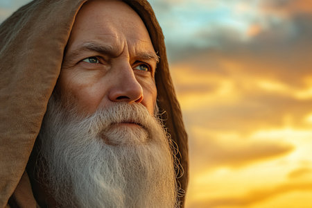 Close up portrait of an elderly man with a white beard in a hooded cloak against a sunset sky