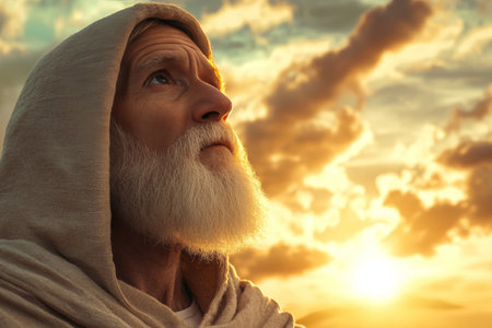 Elderly man in brown hooded robe gazes at the sky during golden hour with illuminated clouds