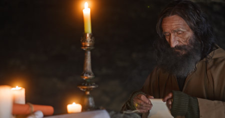 An Elderly Man with Long Hair and a Beard in a Cave Setting during Candlelight Hours