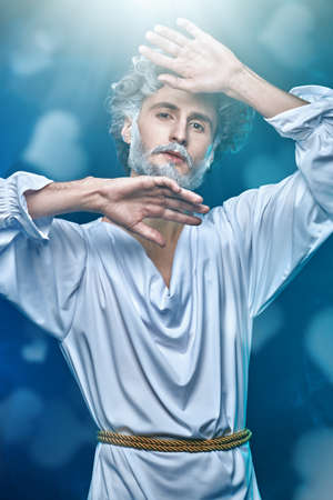 Divine man with a gray beard and curly hair in a white tunic on a blue background with hearts. Art image of God. Roman and Greek mythology, Christianity and religion.