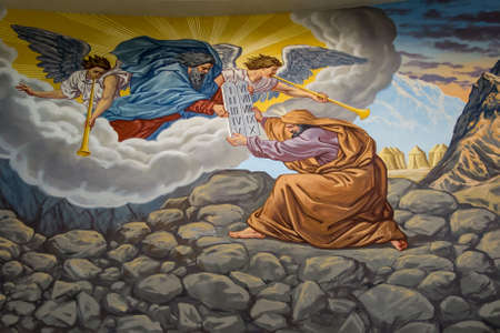 Torun, Poland, May 10, 2022: Inside the Sanctuary of the Blessed Virgin Mary, Star of the New Evangelization and St. John Paul II in Torun. A painting showing the giving of the 10 Commandments on Mount Sinai