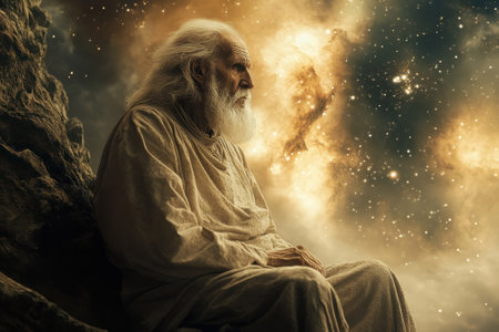 An elder with a long white beard gazes thoughtfully, surrounded by swirling celestial patterns and stars.
