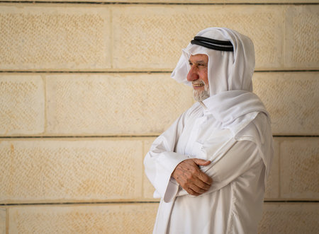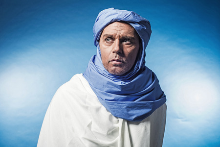 An adult Muslim man in white traditional clothes looks at the camera and expresses emotions. Elderly male sheikh on a background. High quality photo