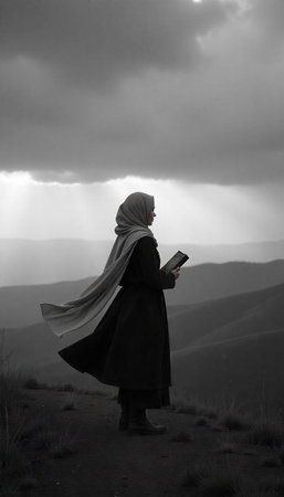Muslim woman reading a holy book in the mountains. Black and white photo.