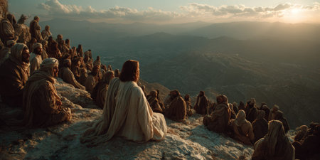 Jesus speaking to the people by parables on the mountain in the midst of nature Generative AI Illustration.