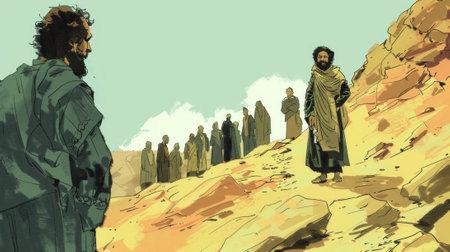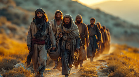 Biblical figures journey across sand toward distant mountains, embodying resilience and resolve