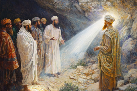 Prophet wearing a white robe and turban is sitting on a rock on a mountaintop, speaking to a large group of followers