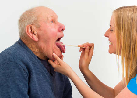 Elderly man with pharyngitis at the hospital, for medical exam.