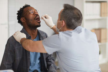 Close up of young African American man taking covid test in vaccination center or clinic, copy space