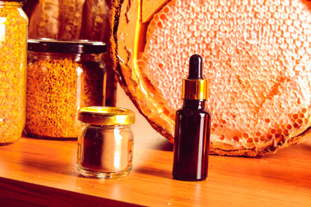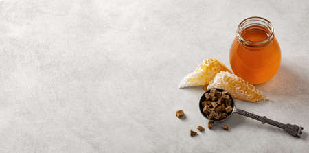 Honey background. Honey in a glass jar, honeycomb and propolis in an iron spoon. Light gray background. Banner. Copy space of your text.