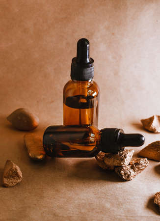 bottle with micellar water, essence of natural oil, serum serum for the face. Some brown glasses bottles with pipette on sandstone stone