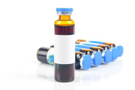 The vaccine comes in a brown glass jar with a brown label. white background.