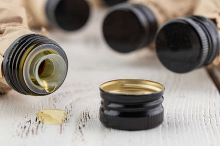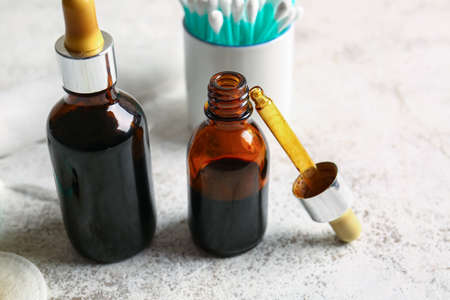 close up of bottles with natural medicinal cbd oil and droppers