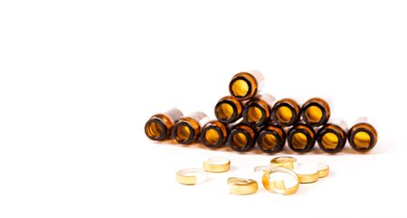 Glass ampoules with liquid on white background, top view