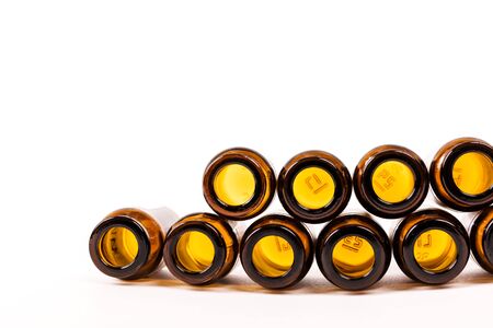 Many empty brown glass medical bottles isolated on a white background. The course of treatment is completed. Mass vaccination. Capacities for tablets. Close-up. Production of containers.