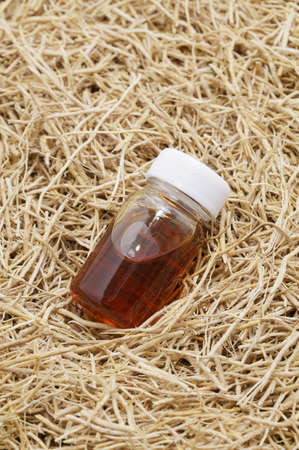 dried vetiver roots and vetiver essential oil in a glass vial, fragrance material
