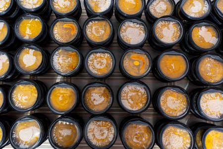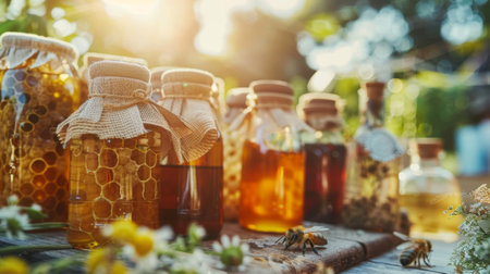 Jars of organic honey on a white background