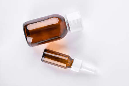 Brown glass bottles with medicine. Amber bottles of big and medium size with medical liquid on white background, top view. Antipyretic syrup over white.