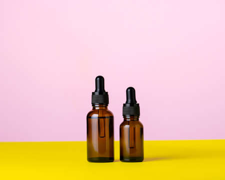 Two brown glass cosmetic oils pink and yellow background