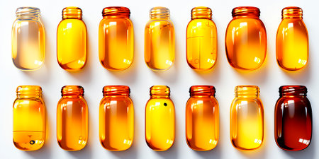 Different grade and color of honey in mason jar over white background
