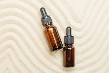 Bottles of serum, oil or cosmetic product on beach sand background. Trendy product presentation on a sandy background.