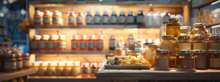 Sealed jar of honey on a pale background. Transparent honey jar with white lid. Concept of natural products, food preservation, and clean design. Banner. Copy space