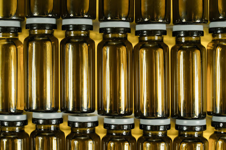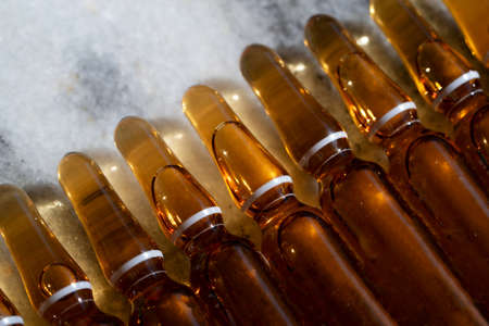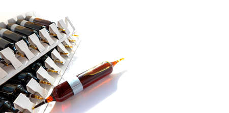 Group object of liquid medicinal agent in limpid glassware in medical laboratory. Group of ampoules with a transparent medicine in a medical laboratory. horizontal perspective view of many brown ampoules set in pharmaceutical packaging white container