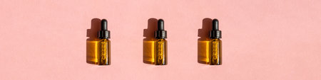 Banner of Transparent amber green glass dropper bottles with liquid inside on pink beige background in the sunlight. Pipette with fluid hyaluronic acid, serum, retinol. Cosmetics, healthcare, beauty