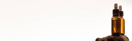 cosmetic bottles with droppers on stone on white background with back light, panoramic shot