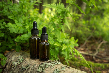 Two glass brown cosmetic containers with pipette are placed against backdrop of a natural forest. Concept of natural organic cosmetics, skin health. selective focus..