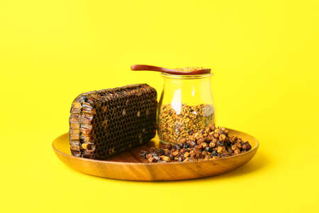 Plate with bee pollen and beebread on color background