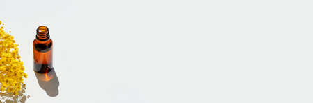 Open amber bottle without cap with serum or essential oil with yellow flowers. White background with daylight and beautiful shadows. Beauty concept for face and body care