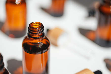 Open amber bottle with serum or essential oil. Pipettes with bamboo cap. White background with daylight and beautiful shadows. Beauty concept for face and body care