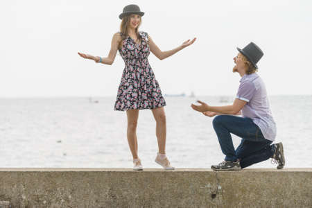 Proposal rejection when a happy man asks in marriage to a woman on the beach