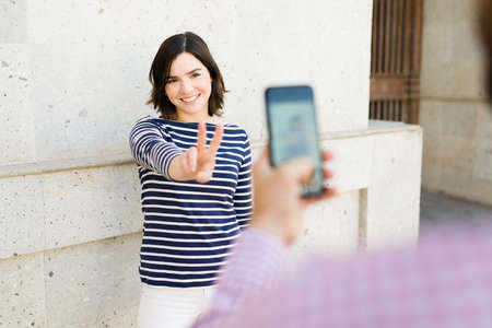 Attractive young woman making the peace sign for a photo. Boyfriend taking a picture of her girlfriend