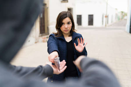 Afraid young woman giving money to a thief on the street. Rear view of an armed criminal stealing from a victim outdoors