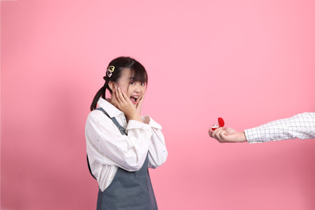 Asian senior man and woman couple in overalls casual clothing with gesture of surprise for Receiving an Engagement Ring isolated on pink background. St Valentine's Day, Women's Day, Birthday