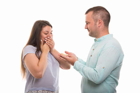 Will you marry me. Photo of gorgeous couple of two people with him proposing to her gifting a ring and her rejoicing before saying yes wearing, jeans denim isolated white grey color background