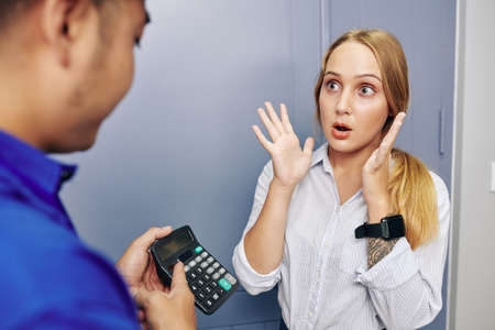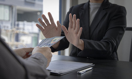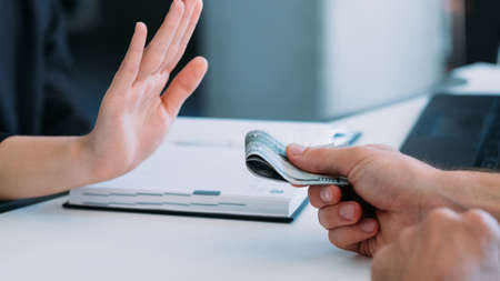 Uncorrupted business. Man offering money in cash. Woman refusing to take bribe. Fair deal and professional relationship.
