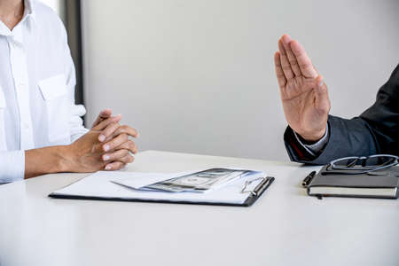 Anti Bribery and corruption concept, bribe in the form of dollar bills, consultant refuse receive money from business woman while making deal to agreement a real estate corporate contract.