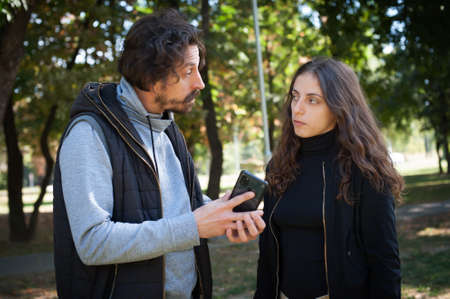 Young woman standing and explaining something to the man with mobile phone in his hand they are in outdoor cafe