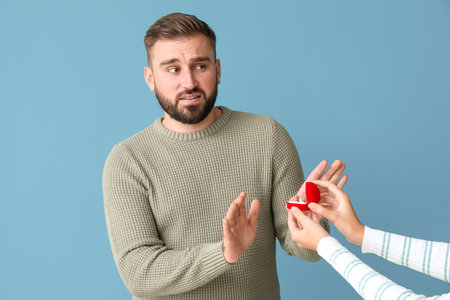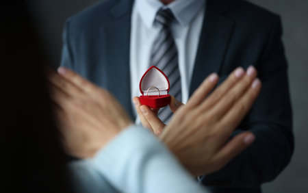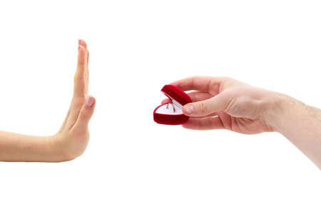 Man is holding wedding ring. Woman is making negative gesture. Rejection of marriage concept