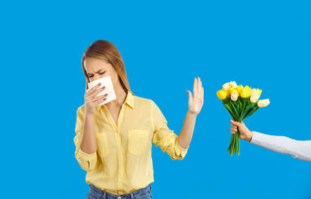 Man and a woman handshaking on green background. Sick businessman with handkerchief tries not to cough.