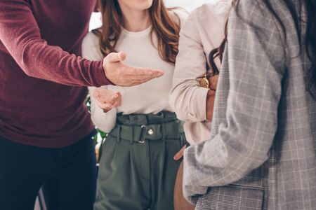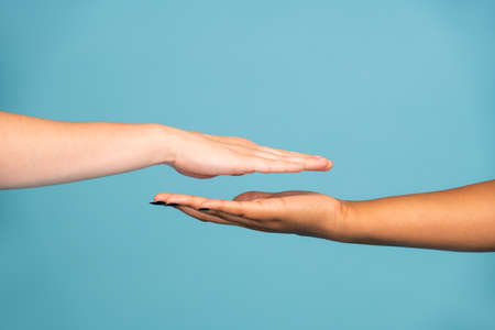 Stop shaming. Racial tolerance. Respect social unity. African and caucasian hands gesturing on gray studio background. Human rights, friendship, intenational unity concept. Interracial unity.