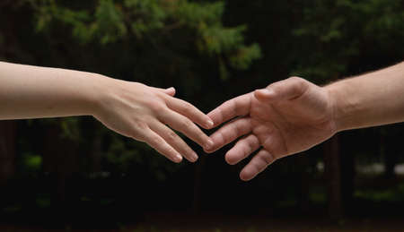 A gentle touch of the hands of a man and a woman on a white background. Love connection help concepts. Be hand in hand. Touching each other.