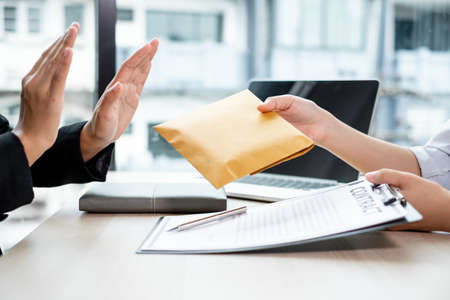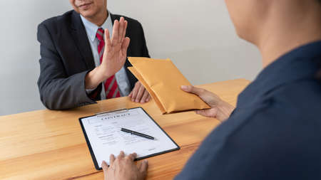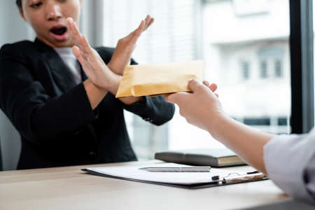 The businessmen refusing accept bribes in a brown envelope at the office, Bribery and corruption concept.