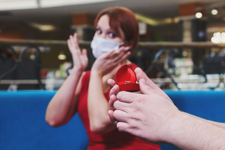 Caucasian excited woman covering her face after being asked for marriage by her lover