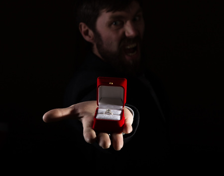 bearded man in a business suit gives a ring in the red box and expresses different emotions on a dark background.